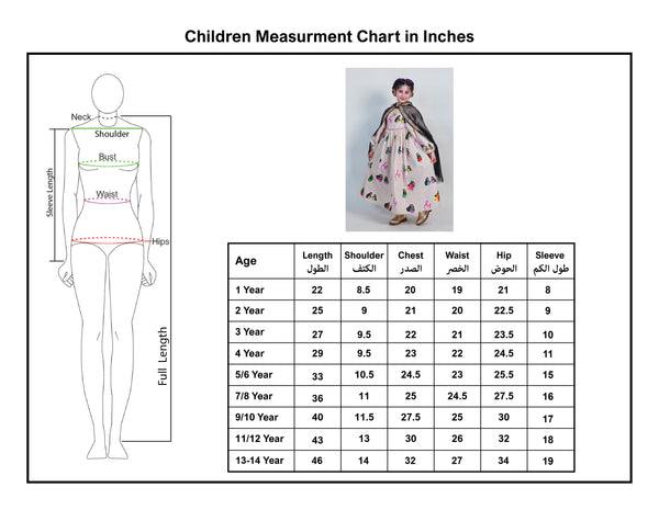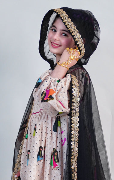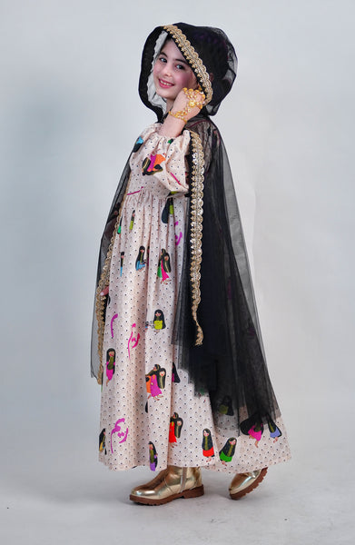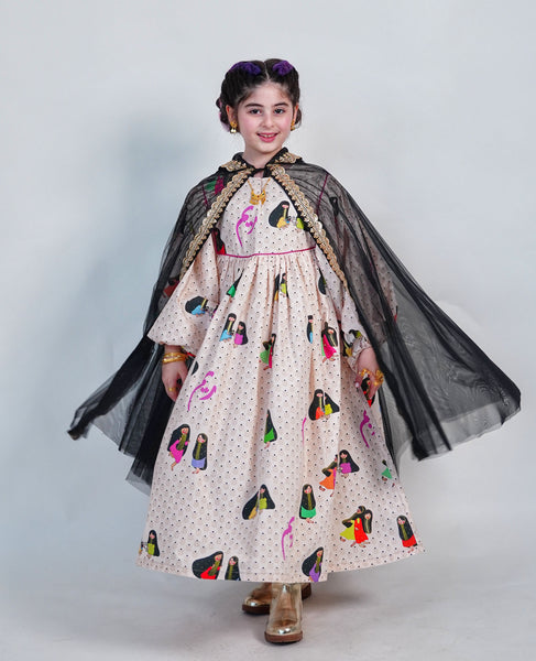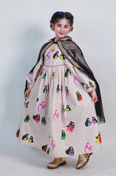 Unique dress and Bukhnag in an exclusive artistic fabric design with an option to add your daughter's name on the dress.